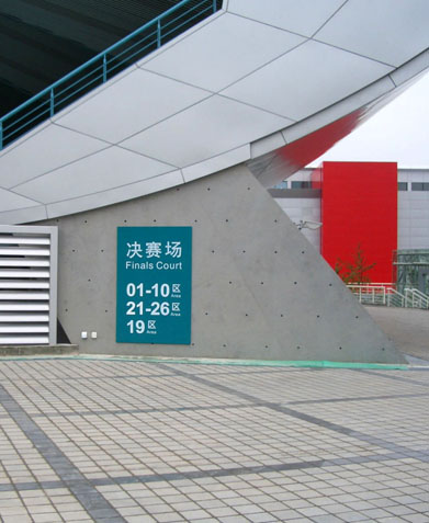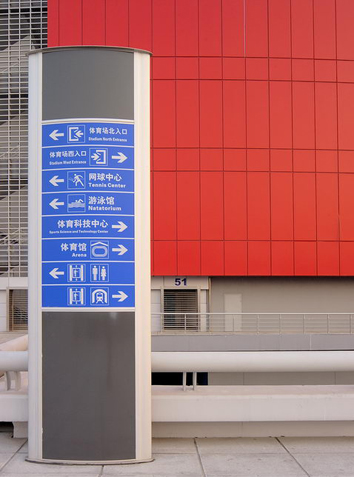 由于該工程的體育特性,增加了標(biāo)識系統(tǒng)設(shè)計的難度,我們由內(nèi)而外、從大到小地深入研究三級導(dǎo)視的分布,將人流導(dǎo)入與分流做到了高效、安全、流暢;對看臺區(qū)域和觀眾席牌數(shù)及座位指示牌的設(shè)計,我們進(jìn)行了嚴(yán)格的優(yōu)選,讓觀眾能根據(jù)指示牌,迅速找到自己的座位。同時,在標(biāo)識系統(tǒng)的設(shè)計中,我們還對標(biāo)識的形式、尺度、色彩、材質(zhì)、照明和安裝等功能屬性進(jìn)行了探討,使該工程獲得最佳實(shí)際效果。經(jīng)十運(yùn)會期間十萬人流量的實(shí)踐證明,我們所設(shè)計的該套標(biāo)識系統(tǒng)完全科學(xué)、合理。