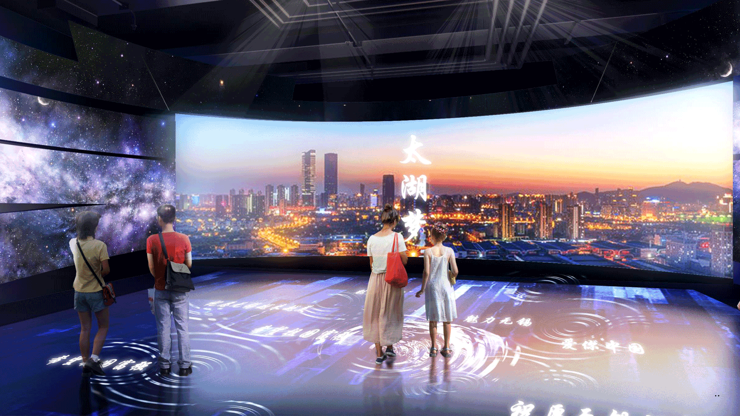 在《太湖美》的悠揚(yáng)樂(lè)聲中開(kāi)啟一段筑夢(mèng)之旅,展望更美好的城市未來(lái)。運(yùn)用大型投影互動(dòng)墻的形式使觀眾在此體驗(yàn)未來(lái)無(wú)錫人的1天,在智能生活、消費(fèi)水平、便捷出行、健身運(yùn)動(dòng)、學(xué)習(xí)工作等方面暢想美好生活。