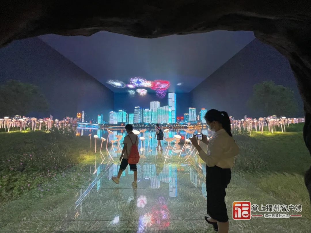 拾級而上,走進成就展的序廳,巨幅漆畫《閩山閩水物華新》氣勢恢宏,描繪了福州海濱城市、山水城市的風貌,一輪紅日噴薄而出、冉冉升起,榕城大地披滿霞光。畫面主要呈現了福州“三山兩塔一條江”,和榕樹、茉莉花、福橘等特色元素,展現福州邁向現代化國際城市的美好愿景,深情表達了習近平總書記詩詞的生動意境。