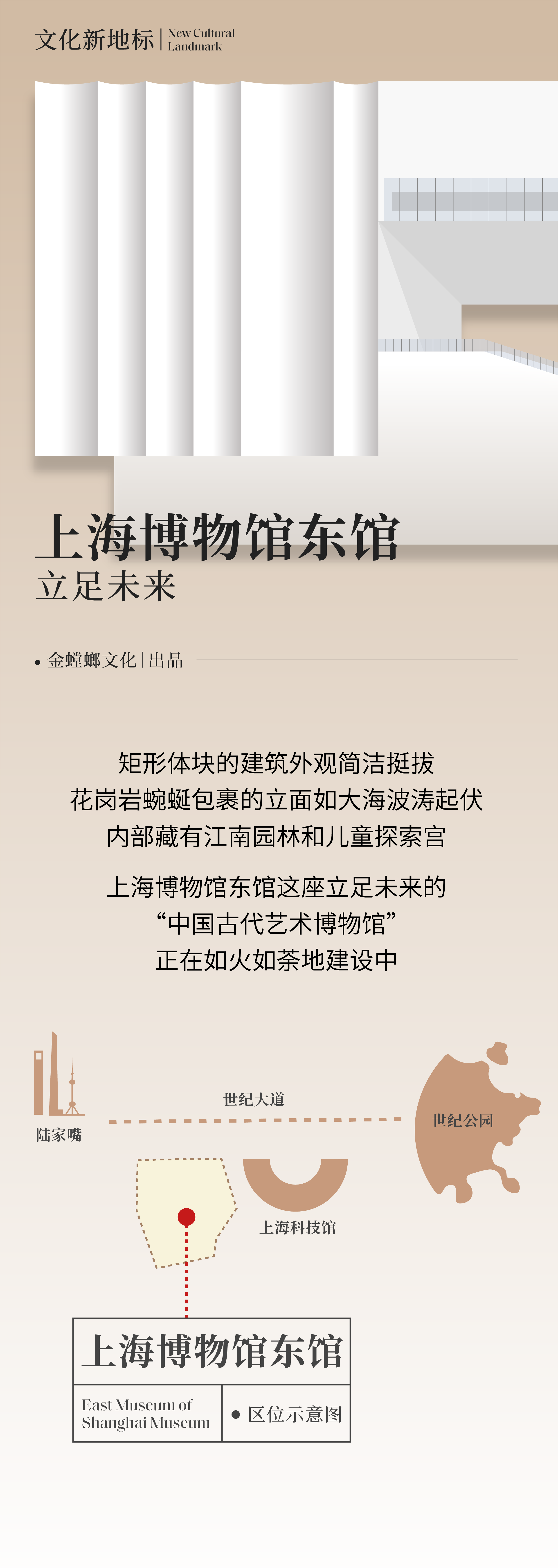 上海博物館東館目前處于建設階段,建成后不僅能較大提升上海博物館收藏文物的展出比例,提供更好的公共文化服務,也能與周邊的上海科技館、東方藝術中心、上海圖書館東館、世紀公園等文化設施形成集群效應,成為上海文化新地標。